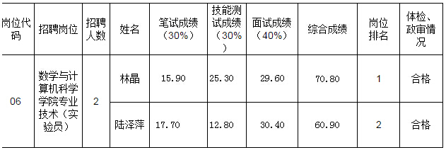 根据《关于福建省省属事业单位公开招聘工作人员考试暂行办法的通知》(闽人发〔2006〕11号)、《2015年春季福州大学公开招聘工作人员方案(二)》的要求,经报名、资格审查、考试(笔试、技能测试和面试)、体检及政审等程序,并经我校领导集体研究,确定林晶等二位同志为我校拟聘人选,现予以公示: